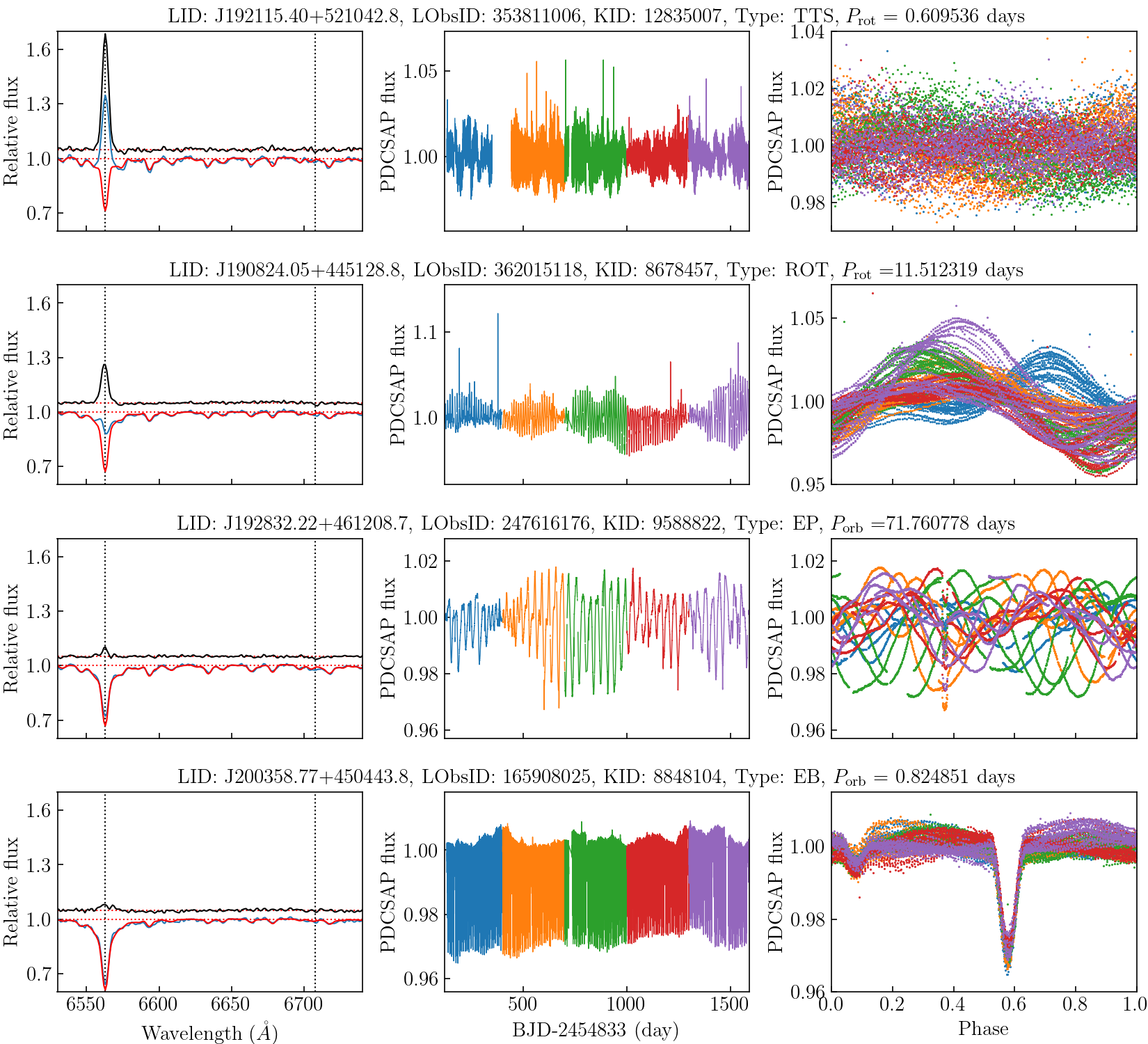 图2. 典型目标源的光谱、时序光变曲线及根据所测量的周期进行位相折叠后的光变曲线。从上到下为金牛座T型星、磁活动恒星、拥有系外行星的磁活动恒星及磁活动的食双星系统。