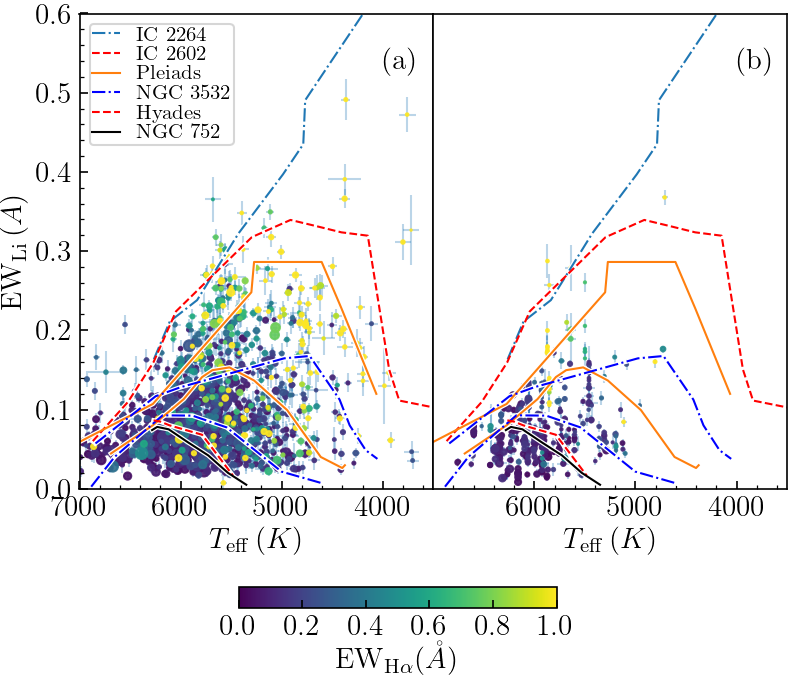 图1. 探测到的磁活动年轻恒星的Li线吸收量与Hα线发射量的分布,及其与疏散星团的对比。大部分目标源的年龄小于7.5亿年,少部分目标源为金牛座T型星。